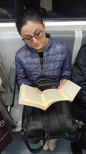 Behold the reader in the crowded metro. She fights off the rising tide of cellular conformity, the endless loop of same-thing distraction by a simple act of concentration. She is in her own way a warrior for humanity.